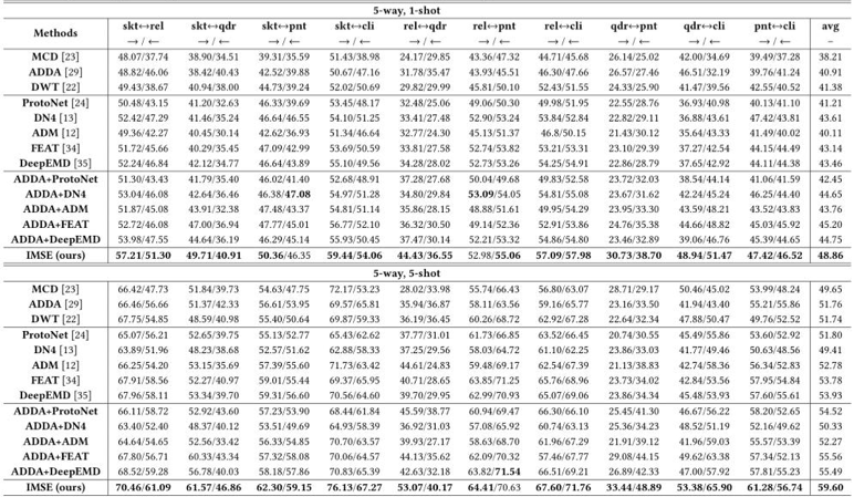 表1展示了一系列方法在DomainNet数据集上的1、5-shot小样本无监督域适应任务性能,而IMSE方法取得了最好的成绩。表2展示了消融实验,实验证明了同时使用特征和相似度模式层面的跨域对齐的有效性,通过相似度层面的跨域对齐,模型的性能被很大的提升。如表3所示,本文在miniImageNet数据集上进行小样本学习(FSL)的对比实验,IMSE方法也表现出了不错的分类性能。总的来说,IMSE方法能够有效地解决小样本无监督域适应问题以及小样本图像分类问题。
