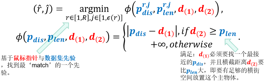 本文的核心之二在于提出了‘房间深度模型’(Room Depth Model),其本质是提取物体和房间之间的先验,即物体与房间的关联关系。传统方法主要关注于物体自身、物体与物体间的关联关系提取,但这并不适用于倾向于独自存在、独自布局的物体。房间深度模型的本质如上图所示:对于数据集中的所有提取好的(pdis,plen),我们尝试将其与当前瞬间的(d(1),d(2))比较,并找出在上下文意义上,最接近的一对(pdis,plen)。比较的方式参考下面的公式,对于当前瞬间鼠标得到的(d(1),d(2)),d(1)必须要找一个最接近的pdis,并且横截距离d(2)要比plen大,即要有足够的横街空间放置这个主物体。文章正文的该部分提供了一个实际的例子用于帮助解释上述两个公式。同时,文章正文包括了从物体与墙体物体的先验提取与使用。