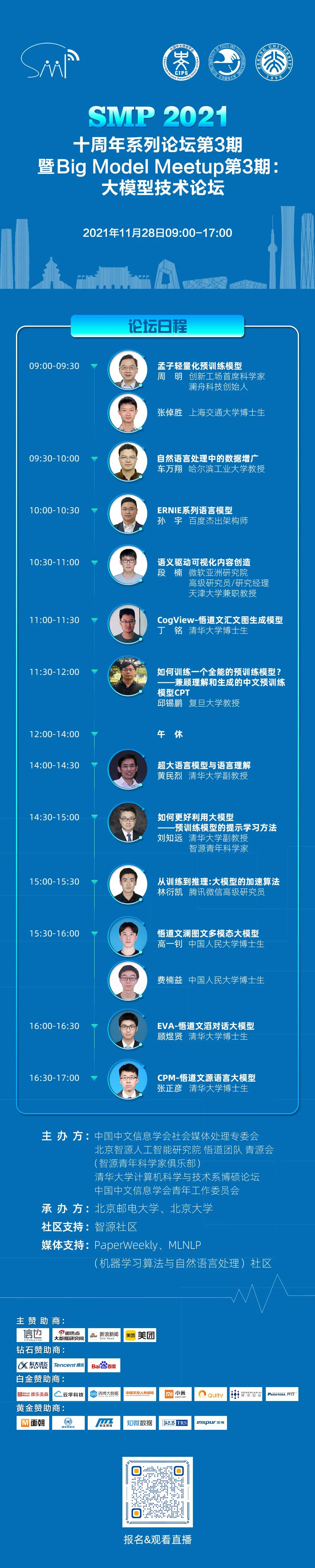 2018年以来预训练模型技术成功将深度学习框架应用于海量无标注数据,在大数据和大算力的支持下,「大模型」一定程度上具备了通用的语言能力,可以非常方便地通过微调技术适配到广泛下游任务,任务性能得到普遍显著提升,成为自然语言处理等领域的最新学习范式,前沿动态日新月异。 「全国社会媒体处理大会(SMP)」创立于2012年,是中国中文信息学会社会媒体处理专委会的旗舰会议,本次论坛为SMP十周年系列纪念活动的第3场。「Big Model Meetup」系列活动则是由智源研究院悟道团队、青源会、清华大学计算机科学与技术系博硕论坛、中国中文信息学会青年工作委员会共同组织的大模型技术社区。本次论坛由智源社区提供社区支持,PaperWeekly、MLNLP(机器学习算法与自然语言处理)社区提供媒体支持。 本次论坛以大模型加速计算技术为主题,于2021年11月28日在线上召开,邀请了周明、车万翔、邱锡鹏等著名学者担任特邀讲者,并邀请多位优秀青年学者做前沿技术报告。
