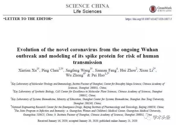 中国科学院上海巴斯德研究所郝沛等人在SCIENCE CHINA Life Sciences(《中国科学:生命科学》英文版),在线发表了题为:“Evolutionof the novel coronavirus from the ongoing Wuhan outbreak and modeling of itsspike protein for risk of human transmission”的论文,推测武汉冠状病毒的自然宿主可能与SARS一样,都是蝙蝠。