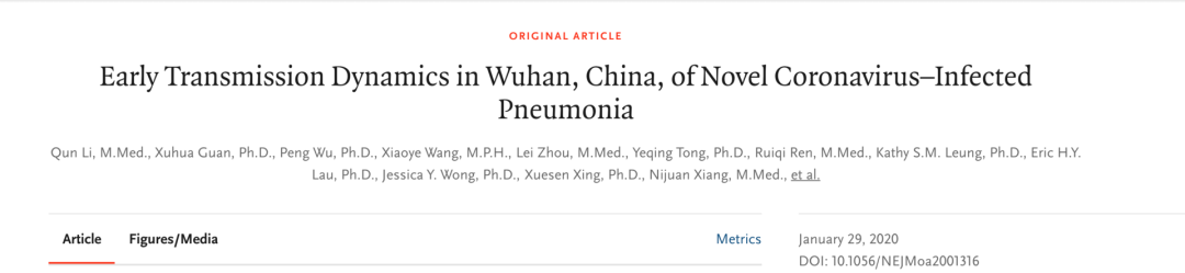 2020 年 1 月 29 日,《新英格兰医学杂志》发表一篇题为 Early Transmission Dynamics in Wuhan, China, of Novel Coronavirus–Infected Pneumonia的论文,披露了迄今为止最为详细的新冠病毒早期流行病学数据(“NEJM医学前沿”对论文做了中文全文翻译:翘首以盼的流行病学数据来了|新冠肺炎),其中最为关键的结论之一为新型肺炎“人传人” 在 2019 年 12 月早已出现,同时披露了有医务人员在 1 月初已经感染。