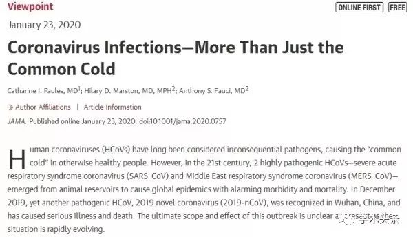 另外, JAMA发表题为“CoronavirusInfections—More Than Just the Common Cold”的观点文章,系统总结了最新的武汉肺炎的进展。