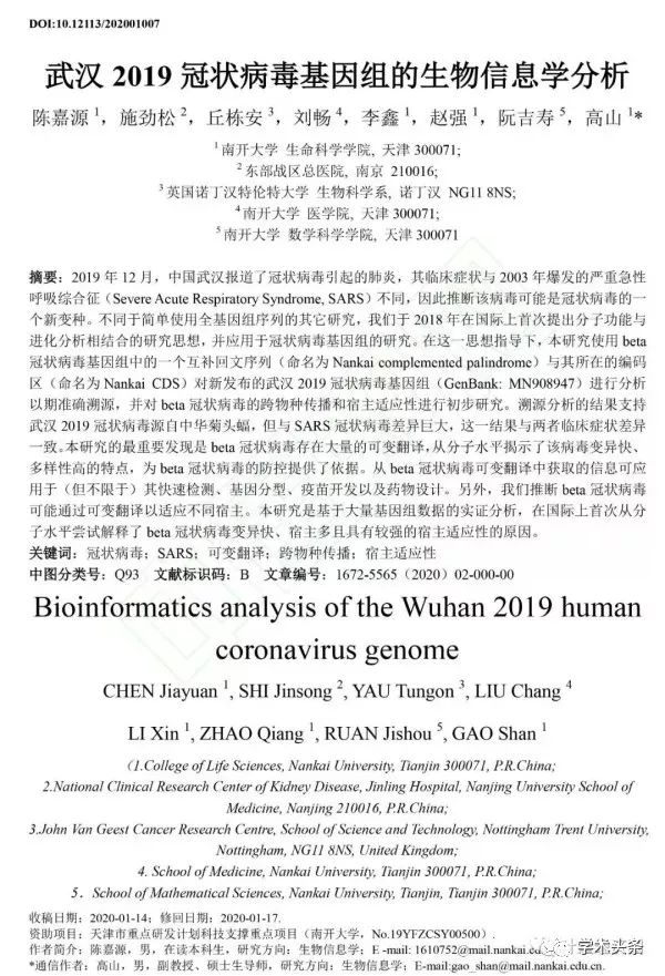 南开大学高山团队的本科生发表文章对冠状病毒基因组进行生物信息学分析。