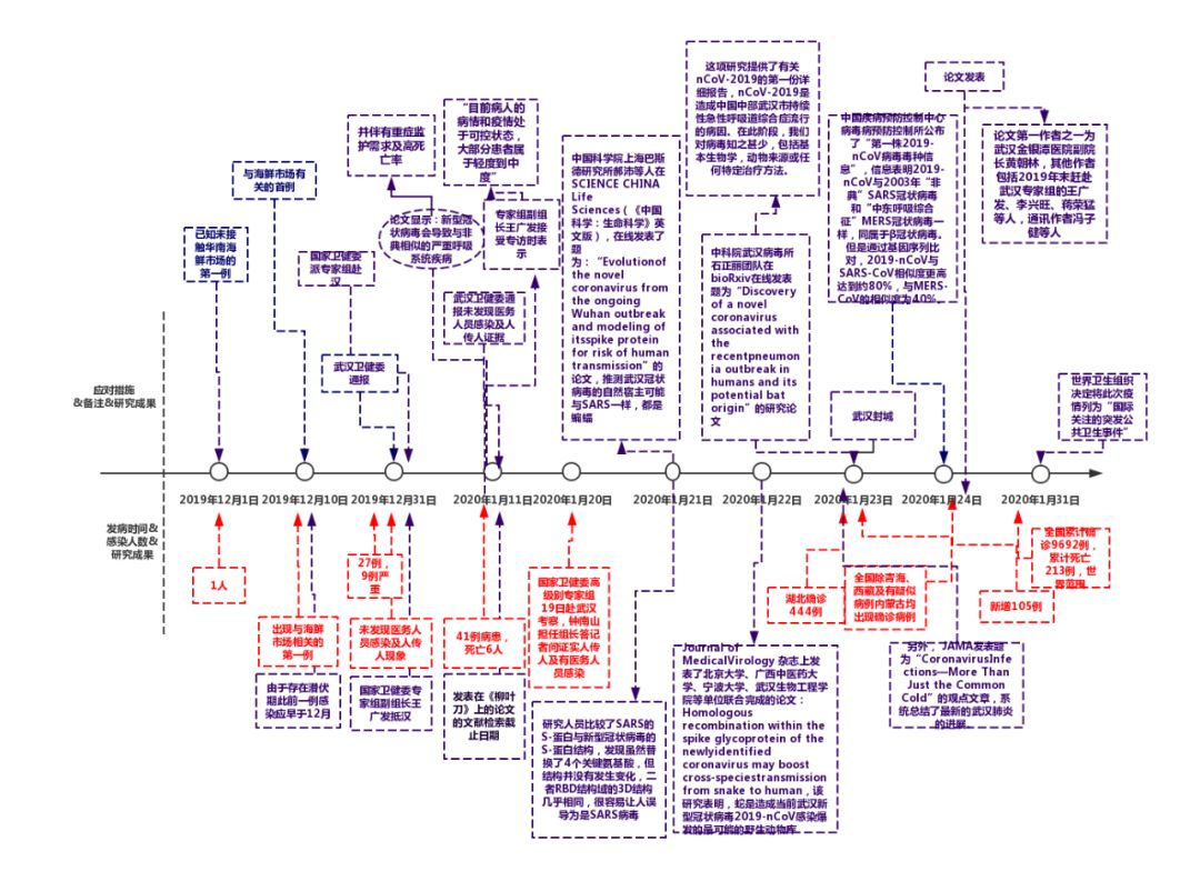 橙色为确诊病例及相关信息,紫色为科研及官方处理进度信息