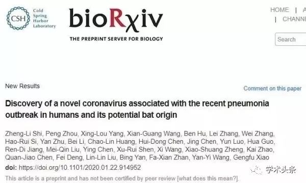 中科院武汉病毒所石正丽团队在bioRxiv在线发表题为“Discovery of a novel coronavirus associated with the recentpneumonia outbreak in humans and its potential bat origin”的研究论文,该研究对先前的结果提出了新的挑战,认为蝙蝠才是最有可能的携带2019-nCoV病毒的野生动物。