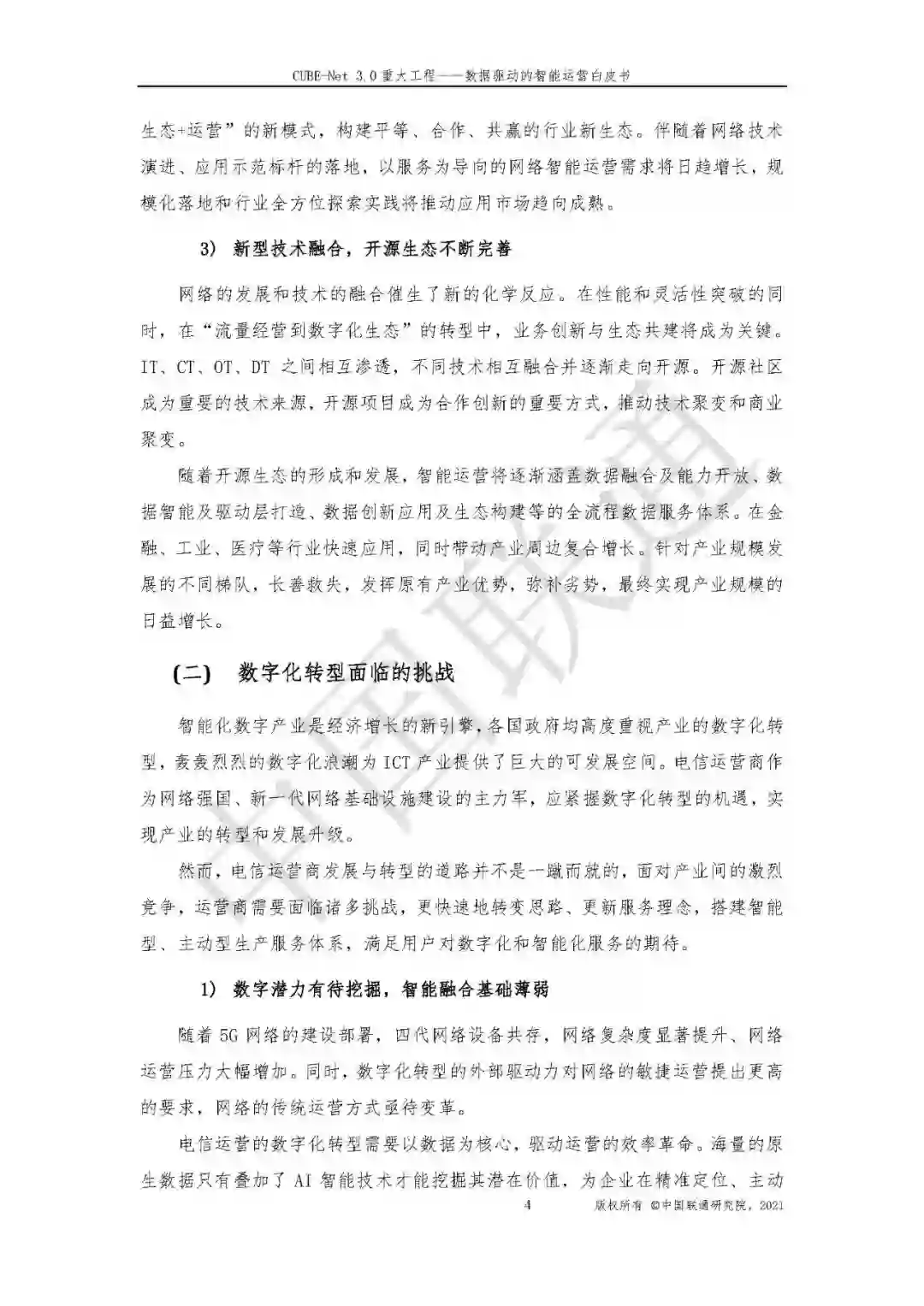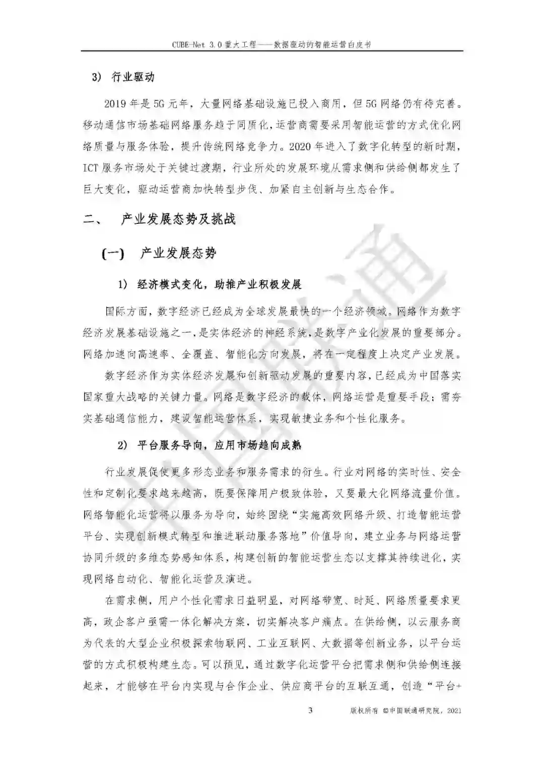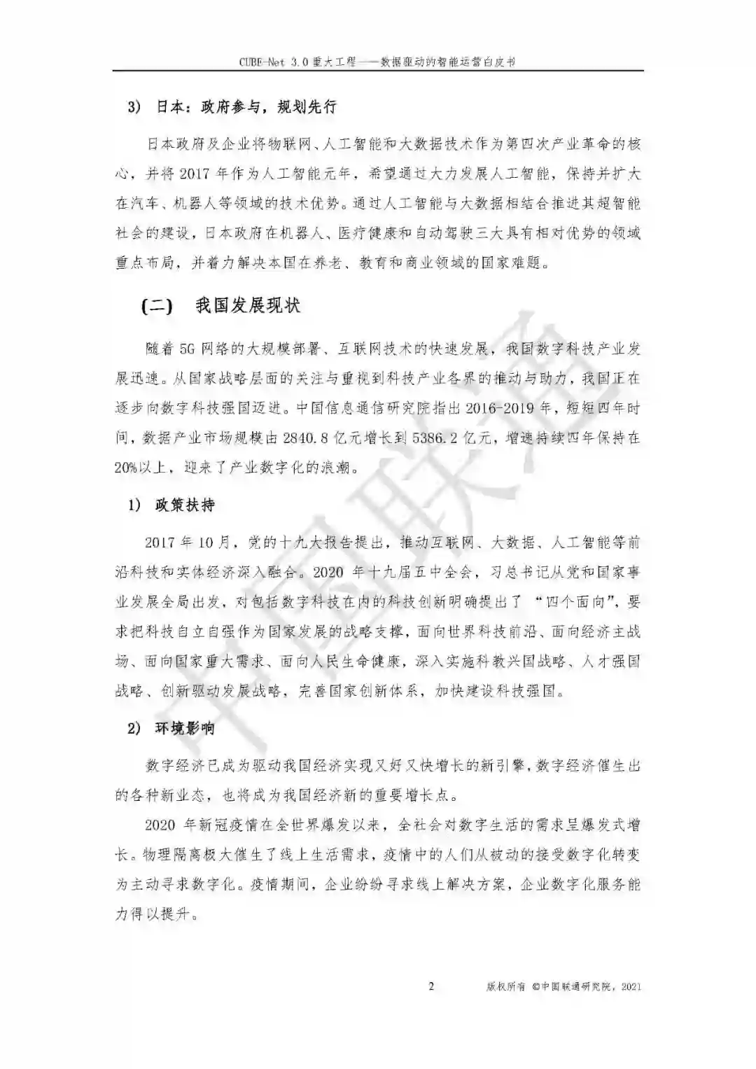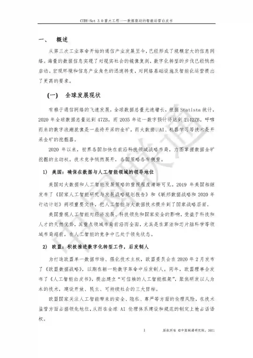 从第三次工业革命开始的通信产业发展至今,已经形成了规模宏大的信息网 络。海量的数据信息实现了对现实社会的镜像复刻,数字化转型的步伐已经悄然 启动。宏观环境和信息产业角色的迅速转变,对网络基础设施及智能化运营提出 了更高的要求。(一) 全球发展现状
