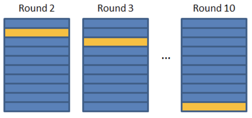 首先可以将训练数据分为10份,将其中的9份作为训练集(如下蓝色部分),其中的一份作为测试集(如下黄色部分)