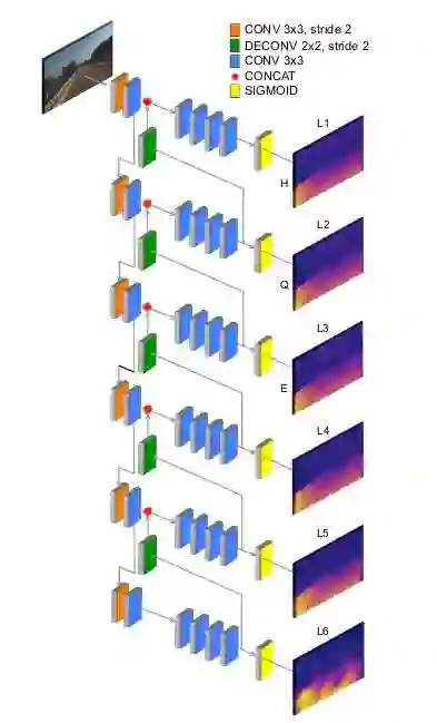 图2 PyD-Net架构。 从输入图像中提取特征金字塔,并且在每个级别,浅网络在该分辨率处推断深度。 然后将处理后的特征上采样到上述级别以细化估计,直到最高级别。