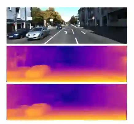 图1(顶部)来自KITTI数据集[1]的输入图像。 最先进的无监督单目深度估计方法[2](中)和提出的PyD-Net架构(底部)之间的定性比较。 我们的模型在标准CPU上实时运行,并且在图中报告的最精确配置中,在Raspberry Pi 3的低功耗ARM CPU上采用1.7 s,具有整体功耗,包括网络摄像头, 约3.5 W.