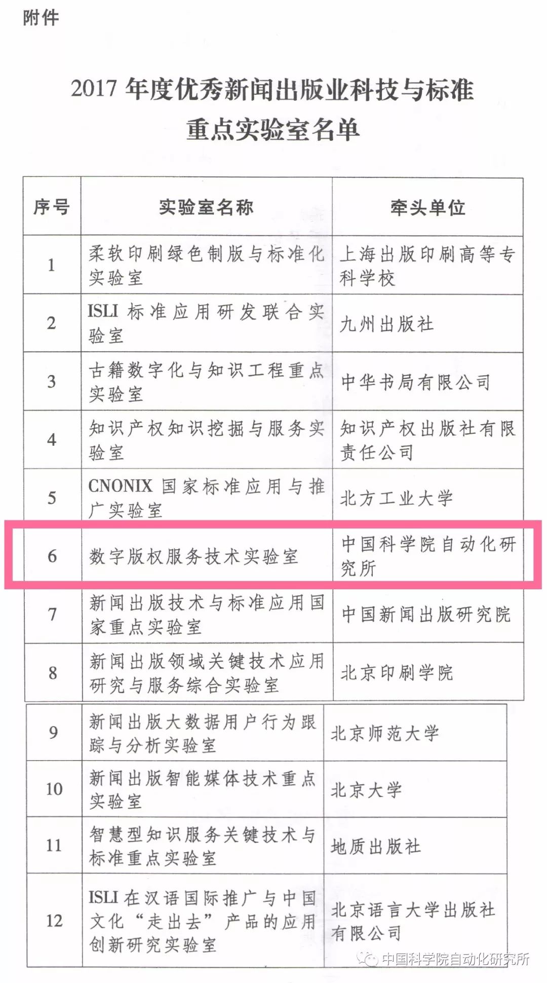 由自动化所牵头建设的"数字版权服务技术实验室"获评国家新闻出版署2017年度优秀新闻出版业科技与标准重点实验室。