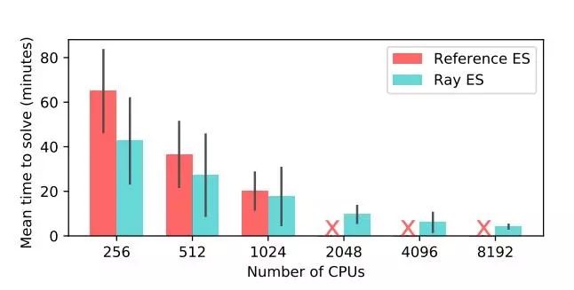 在 Ray 上实现的 ES 算法可以很好地扩展到 8192 核,而特制的系统在 1024 核后便无法运行。在 8192 核上,我们取得了中值为 3.7 分钟的效果,比目前最好效果快两倍。