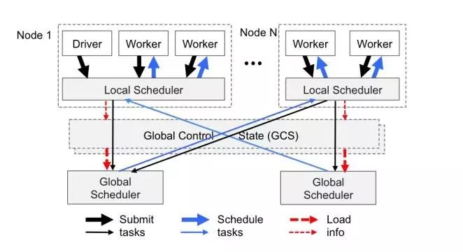 自底向上的分布式调度器。任务由 driver 和 worker 自底向上地提交给局部调度器(local scheduler)。局部调度器可以选择局部调度任务,或将任务传递给全局调度器。通过允许本地决策,降低了任务延迟,并且通过减少全局调度器的负担,增加了系统的吞吐量。