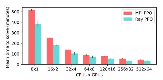 用 Ray 实现的 PPO 算法超越了特殊的 MPI 实现,并且使用 GPU 更少。