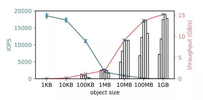 对象存储性能。 对于大对象,单一客户端吞吐量超过了 15GB/s(红色),对于小对象,对象存储 IOPS 达到 18K(青色),每次操作时间约 56 微秒。