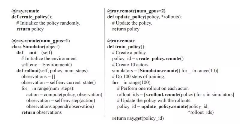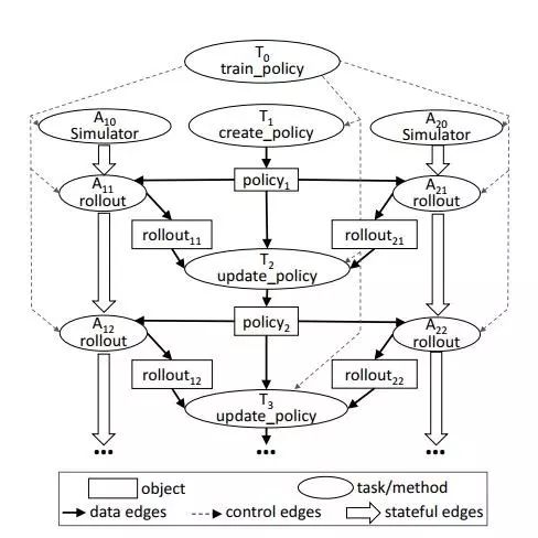 为了支持 RL 应用所带来的异质和动态工作负荷要求,Ray 采用与 CIEL 类似的动态任务图计算模型。除了 CIEL 的任务并行简化外,Ray 在执行模型顶层提供了代码简化,能够支持诸如第三方仿真的状态结构。