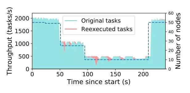 分布式任务的完全透明容错。虚线表示集群中的节点数。曲线显示新任务(青色)和重新执行任务(红色)的吞吐量,到 210s 时,越来越多的节点加回到系统,Ray 可以完全恢复到初始的任务吞吐量。