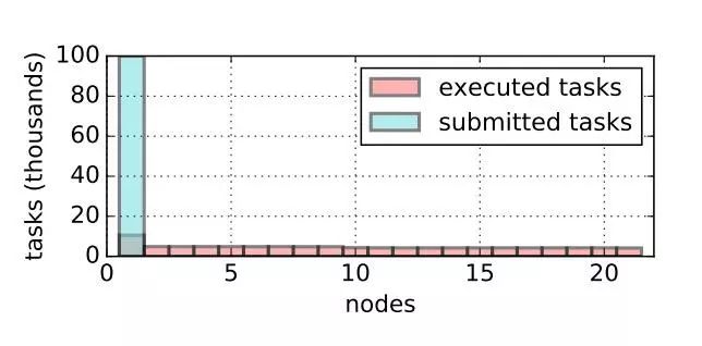全局调度器的主要职责是在整个系统中保持负载平衡。Driver 在第一个节点提交了 100K 任务,由全局调度器平衡分配给 21 个可用节点。
