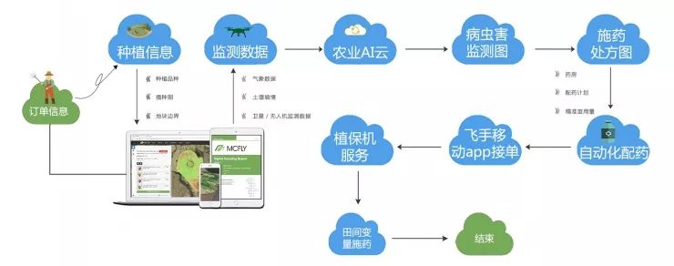 麦飞科技将农业遥感、无人机、大数据、人工智能结合起来,以提供精准科学施药技术。具体的流程是:无人机监测、生成光谱图、数据上传大云端服务器、生成施药处方图、植保机喷洒农药。