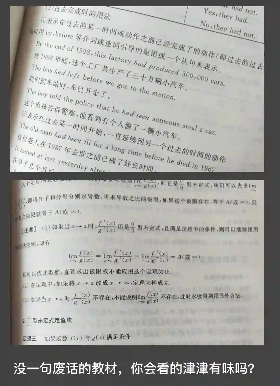 比如学校的教材,像四六级词汇、语法,高等数学等,里面都是干货,需要深度学习的内容,甚至没有一句废话。