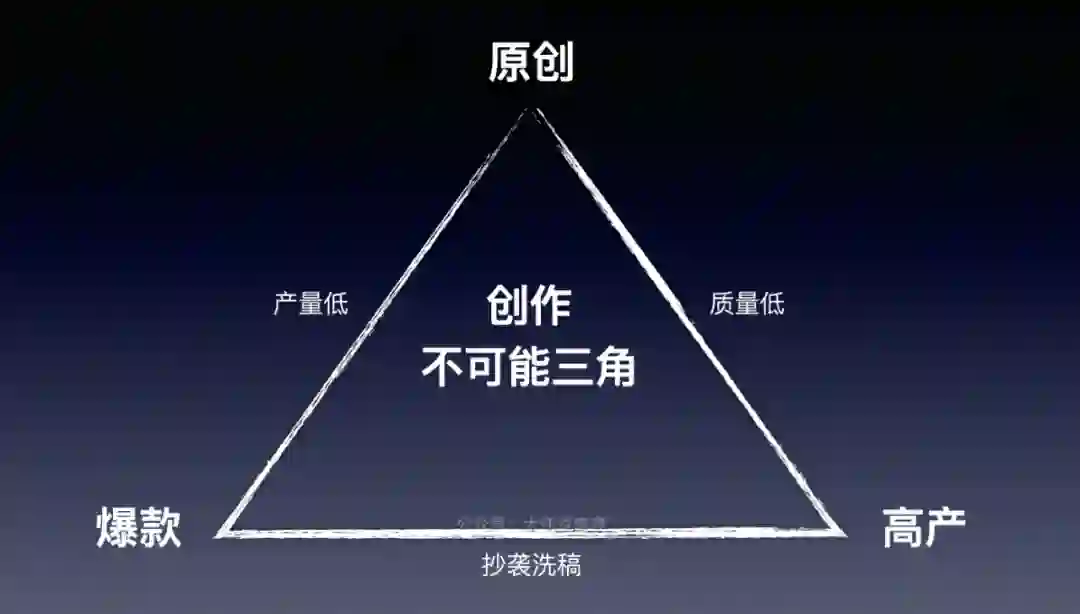 这就是内容创作的一个不可能三角模型:原创、爆款、高产。