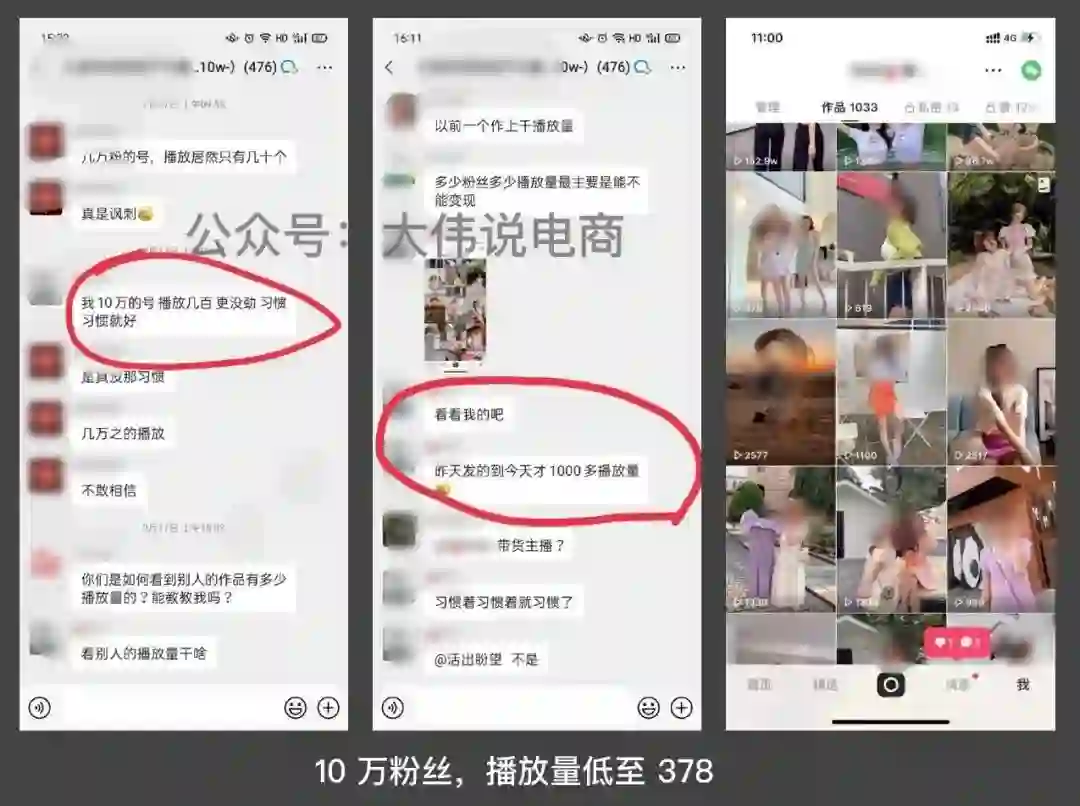 如果我自己的账号不具有说服力,在创作者群里的的“吐槽”也是如此,一个坐拥 10 万粉丝的账号,播放量最低竟然只有 378,上哪说理去。