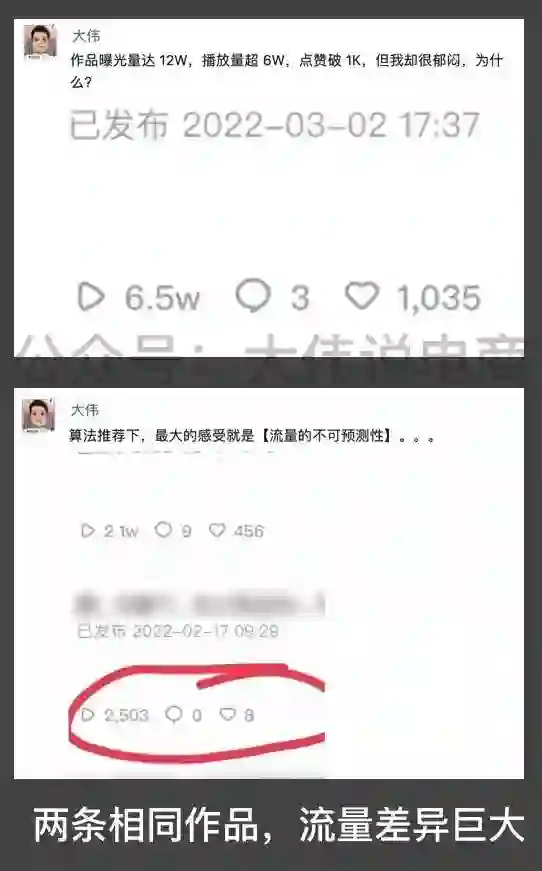 比如我运营的其中一个短视频账号,其中一条作品发布 12 小时后,达到 6W 播放,破 1000 赞;而另一条作品,在发布 12 小时后,只获得 2000 播放和 8 个赞。并且这两条作品的内容、风格、文案几无二致。
