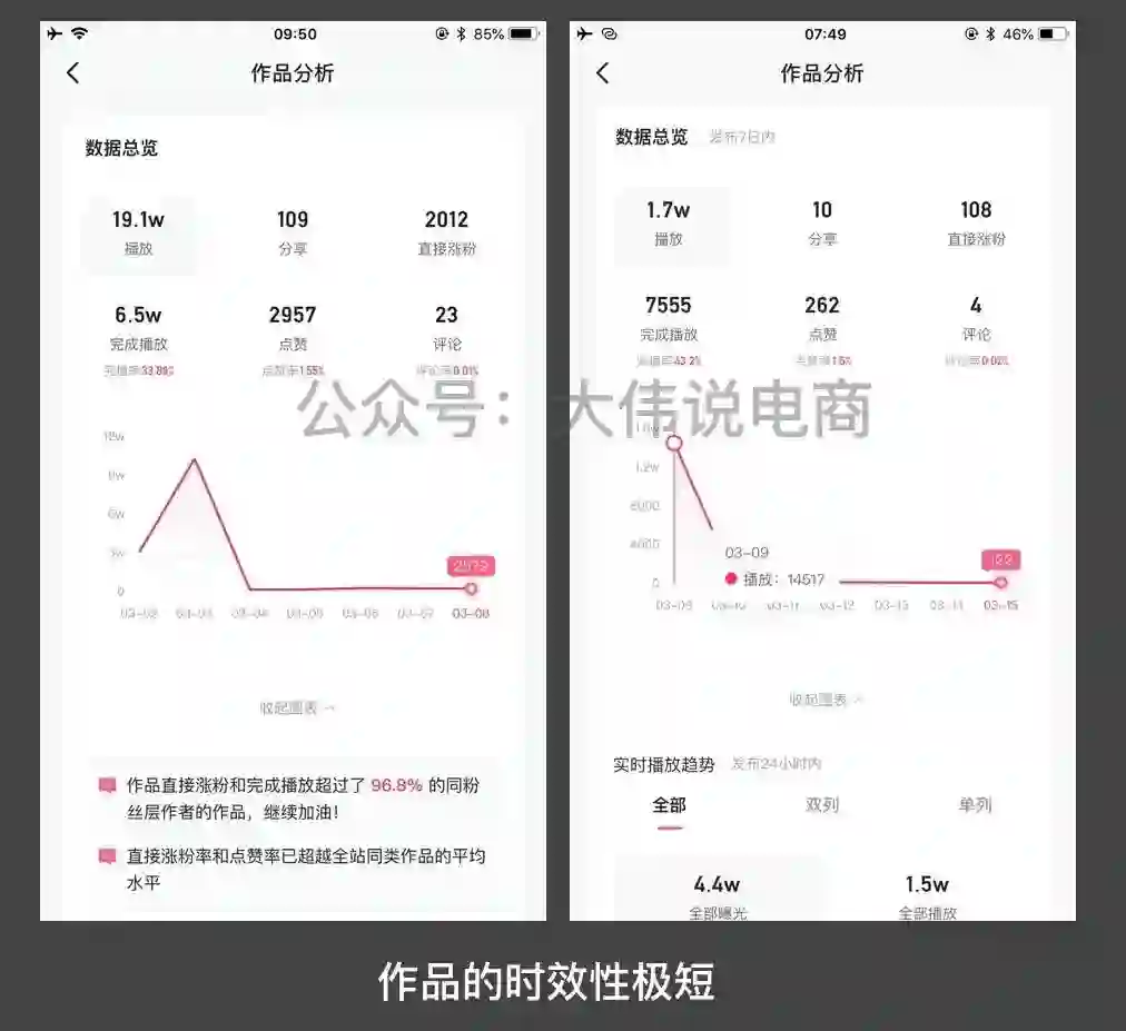 在算法推荐下,“时效性”是一个非常重要的指标,所以每条作品是有它自己的生命周期的,而且极短。“时效性”有两个层面,一个时时间的时效性,一个是内容创意的时效性。