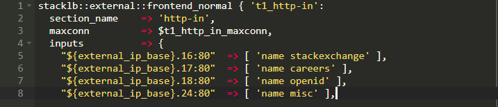 记得我们前面提到的dnscontrol吗? 这将使所有这一切都保持同步。 由于JavaScript配置/定义,我们可以轻松地共享所有并简化代码。 我们匹配所有IP的最后一个八位字节(在所有数据中心的所有子网中),所以在一些变量中,AD和外部的所有DNS条目都对齐。 这也意味着我们的HAProxy配置也更简单,它归结为: