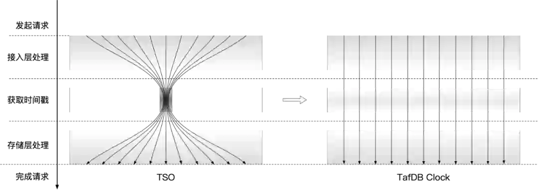 通过 TafDB Clock 我们消除了时钟的单点隐患,同时不增加额外的事务逻辑复杂度。如图所示,当使用 TSO 时,系统中所有的请求都需要挤在一起访问单点的时钟服务以获取时间戳,而单点是存在上限的,只能支撑百万 QPS 规模,并且一旦时钟服务异常就会影响集群全部的请求。而使用 TafDB Clock 方案时,所有的请求不再需要访问某个共同的节点,上述单点问题也就被消除了。