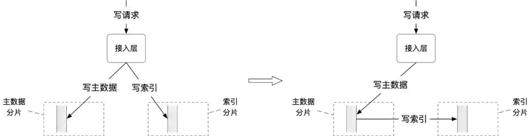 针对平坦 Namespace:我们分析发现大部分业务场景需要的二级索引不要求极致的时效性。基于这个特点我们实现了一种机制来异步写入索引数据,以略微降低索引时效性为代价,将绝大部分写入都控制在单个分片上。如图所示,原本一个写入需要同时完成主数据和索引数据的写入,需要通过分布式事务同时完成两分片操作。而优化后,由于无需同时写入索引数据,系统只需完成主数据分片的数据写入后就可返回。