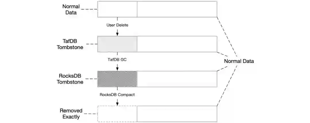 为了保证事务的实现,TafDB 采用多版本的数据存储设计,与 RocksDB 类似,也使用标记删除的方式。被标记的垃圾数据最终会通过 GC(多版本垃圾回收)机制异步完成其在 RocksDB 中的删除。不过如上所述,磁盘上数据的实际删除还要等待 RocksDB 的 compaction 完成。