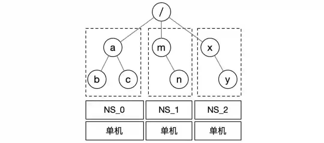 基于子树划分:该架构方案通过将层级目录树拆分成多个子树,并将每颗子树按照相应的负载策略部署到不同的 Meta 节点中,但缺点是容易产生热点,负载均衡难以实现,扩展性不够好,同时难以做到跨子树的 Rename,典型的实现如 HDFS Federation、CephFS、IndexFS。