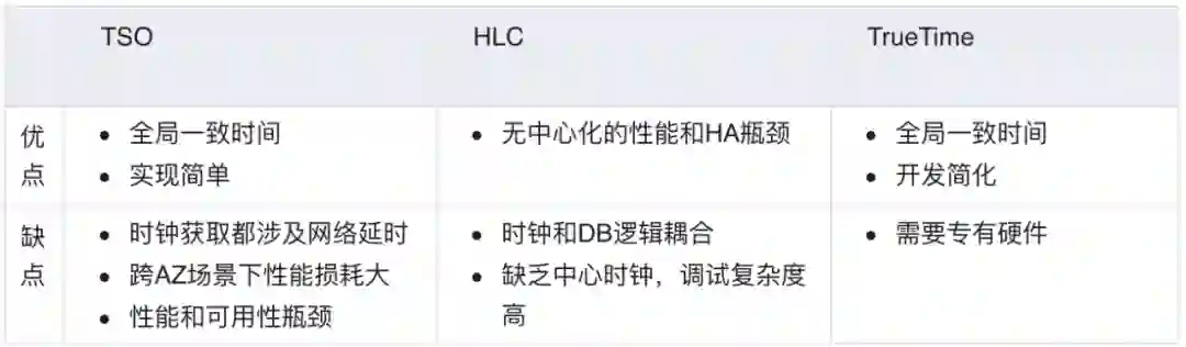 业界的时钟解决方案分为三大类:TSO(全局发号器)、HLC(混合逻辑时钟)和 TrueTime。全局发号器方案的问题就是上面提到的可用性和性能瓶颈;CockroachDB 采用了 HLC 方案,HLC 没有中心化的性能和可用性瓶颈,但是这需要和 DB 逻辑耦合,实现复杂度高;Google 的 Spanner 采用的是 TrueTime 方案,它是一个完美的方案,但是需要依赖专有硬件。