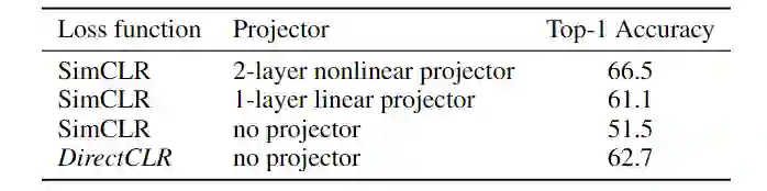 作者提出在对比学习中通过直接向损失函数发送表示向量的子向量来移除projector,这个操作也称为DirectCLR。与所有最新的自监督学习方法相比,这种方法能够直接优化表示空间。
