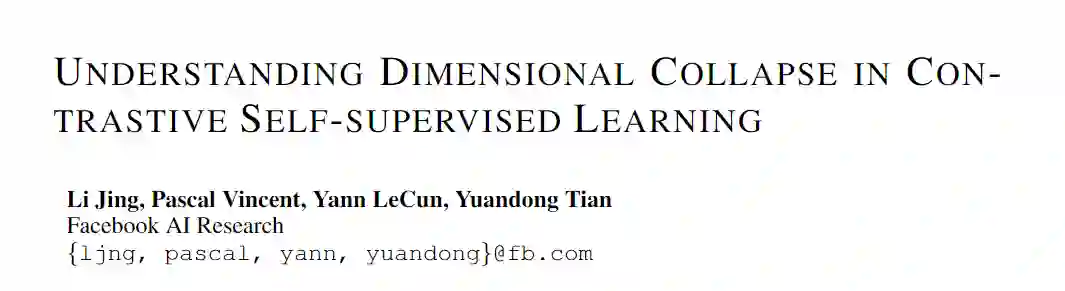 按照直觉来说,对比学习中应当不会出现这种崩溃问题,因为对比学习的方法中明确使用损失函数中的正例和负例,可以直观地利用所有维度推测负例的排斥效来防止这种维度崩溃。然而,与直觉恰恰相反,对比学习方法仍然受到维度崩溃的影响。