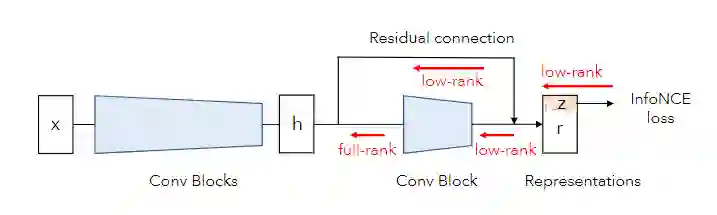 有人可能会认为DirectCLR 中的对比损失没有在表示向量r[d0:]的其余部分应用梯度,事实上,整个表示向量r 经过训练并包含有用的信息。表示向量的其余部分通过残差连接从最后一个剩余块之前的层复制。表示的这一部分不直接经历来自损失函数的梯度,而是通过卷积块由梯度更新,残差连接通过最后一个卷积块的满秩梯度。