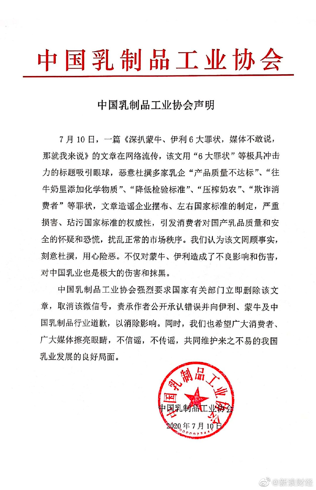 据中国乳制品工业协会官方微信7月10日消息,针对网传《深扒蒙牛、伊利6大罪状,媒体不敢说,那就我来说》一文,中国乳制品工业协会发布声明回应,称该文罔顾事实,刻意杜撰,用心险恶。(新浪财经)