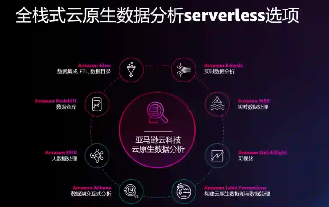 为了让构建方式更敏捷,在 2021 亚马逊云科技 re:Invent 大会上,亚马逊云科技宣布推出更多数据分析服务的无服务器版,借助无服务器的能力,让用户可以更敏捷地构建自己的数据存储、分析、智能应用解决方案。