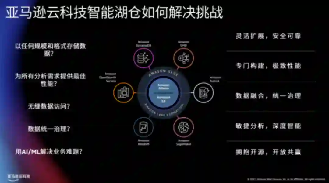 这件事情启发了“智能湖仓”架构的形成。在 2020 年的亚马逊云科技 re:Invent 大会上,亚马逊云科技正式发布“智能湖仓”。如果从早期的技术探索开始算起,在 2021 亚马逊云科技 re:Invent 大会上发布的 Serverless 能力,代表了“智能湖仓”架构的第 8 轮技术演进。如今,“智能湖仓”基于 Amazon S3 构建数据湖,绕湖集成数据仓库、大数据处理、日志分析、机器学习数据服务,利用 Amazon Lake Formation、Amazon Glue 等工具可以实现数据的自由流动与统一治理。