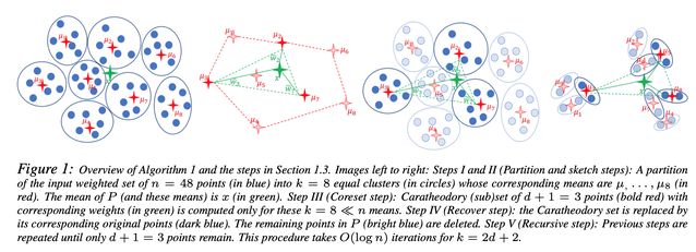 该方法依赖于 Caratheodory 定理,其表明一个核心集合(d2 + 1 的点集合,维度为 d)足够表征凸集中所有 n 个点。该论文的新颖之处在于它提出了分治算法(divide-and-conquer),从而通过可接受的复杂度(O(nd + d5 log n),其中 d << n)抽取核心集合(coreset)。