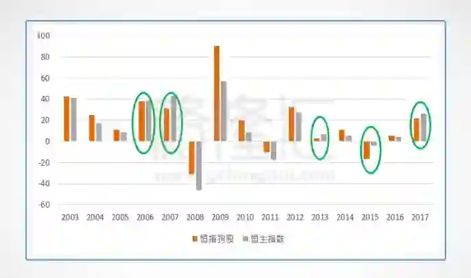 假如你用固定金额进行投资,每年花5分钟,按照股息率挑选出十只“狗股”买入,并且在第二年“去糟求精”。回测2003年1月1日至2017年7月27日数据显示,在过去15年,只有5年的“狗股”是跑输恒生指数(已经考虑派息)的表现,跑赢恒指的概率达到66.67%。