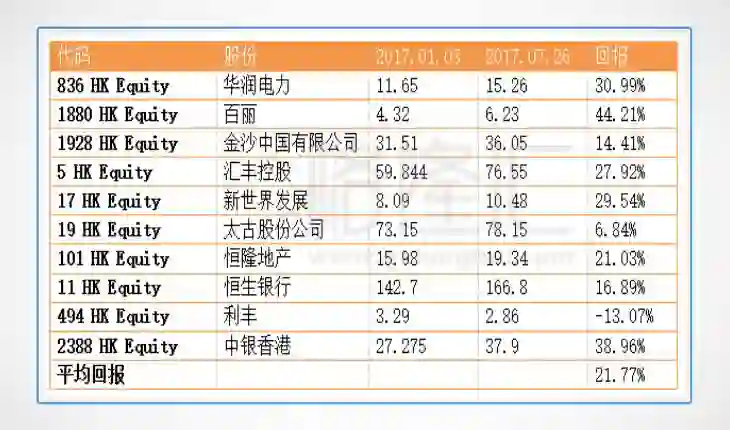 图:2017年恒指“狗股”,云锋金融整理(2017年7月27日)