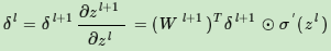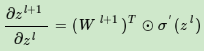 现在我们把输出层的梯度算出来了,那么如何计算上一层L−1层的梯度,上上层L−2层的梯度呢?这里我们需要一步步的递推,注意到对于第l层的未激活输出zl,它的梯度可以表示为: