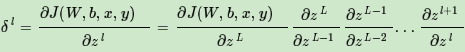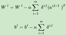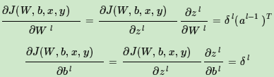 如果我们可以依次计算出第l层的δl,则该层的Wl,bl很容易计算?为什么呢?注意到根据前向传播算法,我们有: