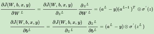 其中,aL和y为特征维度为n_out的向量,而||S||2为S的L2范数。现在我们开始用梯度下降法迭代求解每一层的W,b。首先是输出层第L层。注意到输出层的W,b满足下式: