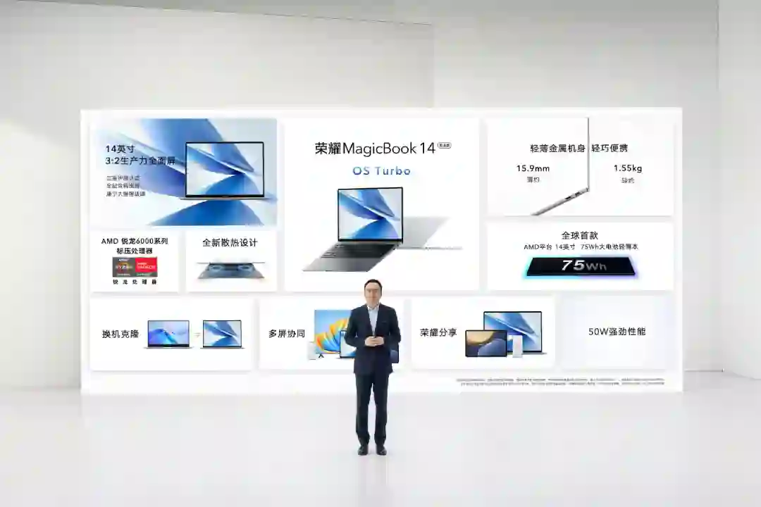 荣耀MagicBook14 锐龙版是荣耀首款搭载 OS Turbo 的 AMD 笔记本,该机最高搭载搭载 AMD 锐龙 7 6800H 标压处理器。据荣耀官方称,在 OS Turbo 加持下,该机功耗最高下降 24.1%,续航时长最高可提升 35.5%。75Wh 电池 + 65W 便携快充,可以给用户带来不俗的续航保障。软体检方面,该机拥有系统清理和异常拦截功能加持,带来流畅纯净的操作系统体验。