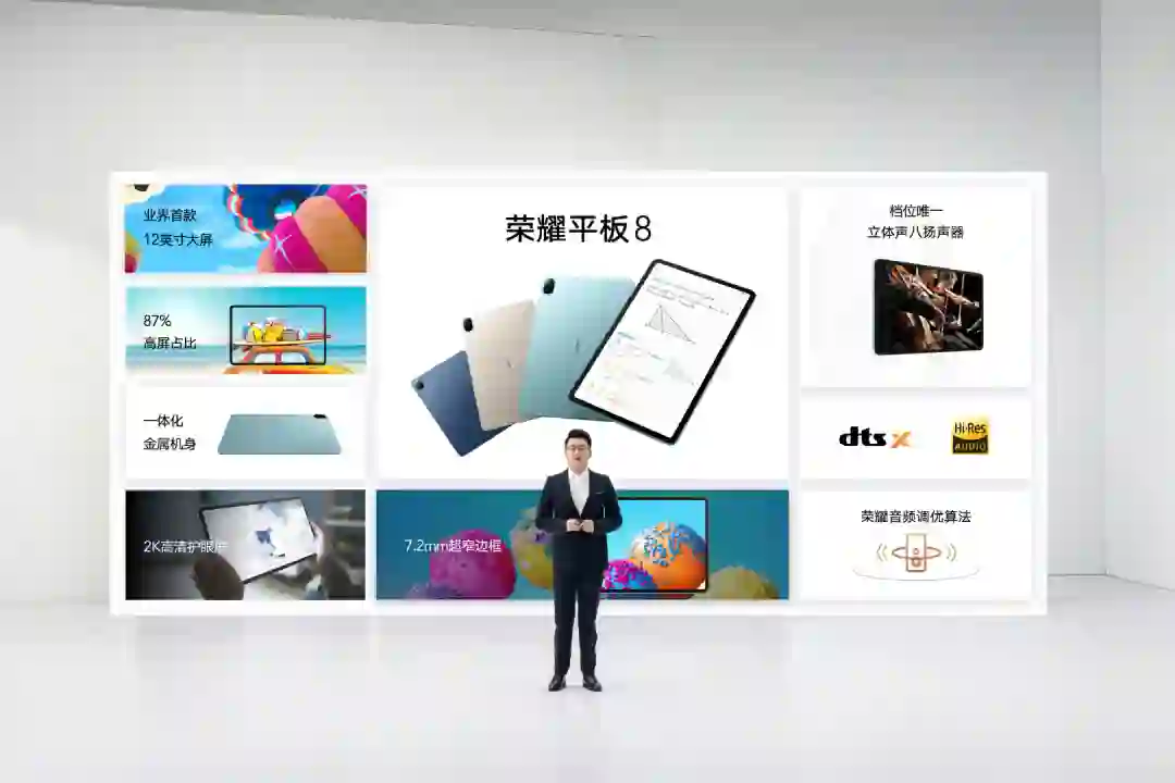 荣耀平板 8,这是一款搭载 12 英寸高清全面屏,该屏幕拥有 7.2mm 窄边框、87% 的高屏占比、10:6 的屏幕比例、2K 高清分辨率、10.7 亿色彩显示等特性,薄至 6.9mm、轻至 520g 的一体化金属机身,荣耀平板 8 是档位唯一 12 英寸立体声八扬声器平板,该机搭载了骁龙 680 处理器,其提供薄荷绿、曙光蓝、晨曦金三色可选。