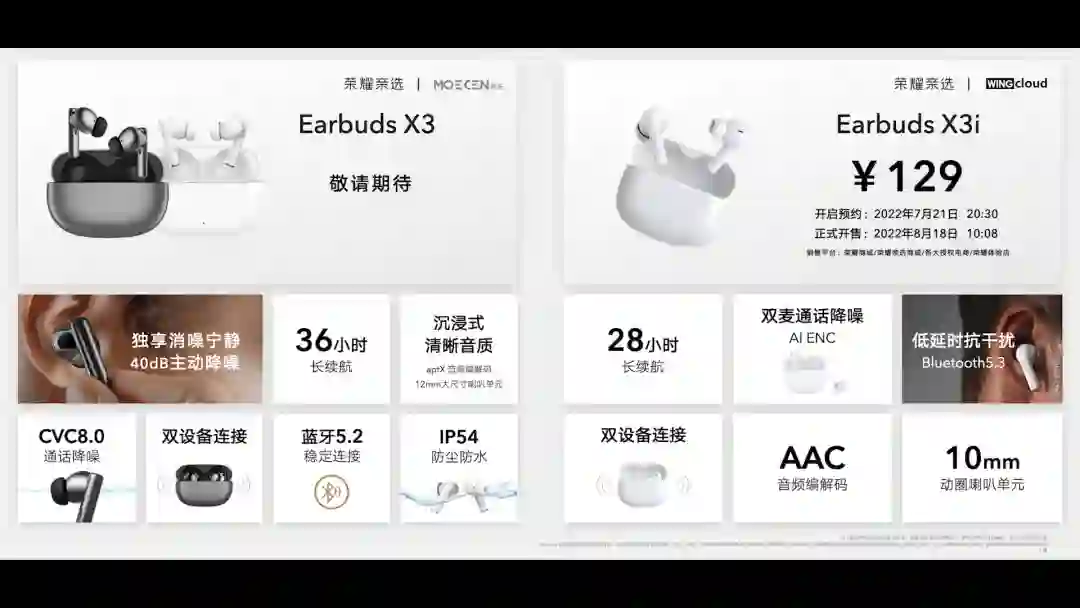 荣耀亲选 Earbuds X3 系列耳机,主动降噪深度可达 40 分贝,多种降噪模式满足休闲、运动、出行、娱乐等不同场景的降噪需求;长达 36 小时的超长续航,能做到充一次电听 700 首歌;搭配 12mm 大尺寸生物振膜喇叭单元,高通 aptX 高清音频编解码,随时随地沉浸享受高质量音乐。荣耀亲选 Earbuds X3 系列的两款耳机都支持双设备连接,智能实时切换,操作更简单高效。