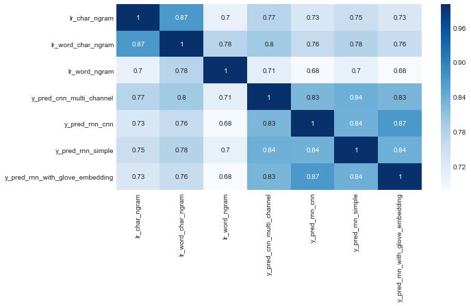 sns.heatmap(predictions.drop('y_true', axis=1).corr(method='kendall'), cmap="Blues", annot=True);结 论