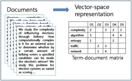 用矩阵表示数据集,矩阵的每一行表示一条推文,每一列表示从推文(已经经过分词和清理)中提取的特征(一元模型或二元模型)。每个单元格是 tf-idf 分数(也可以用更简单的值,但 tf-idf 比较通用且效果较好)。我们将该矩阵称为文档-词项矩阵。